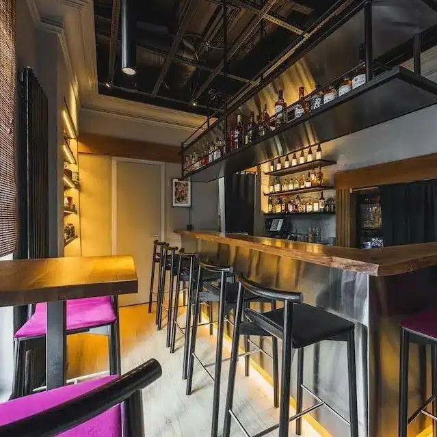 В интерьере бара используется укиё-э — направление в изобразительном искусстве Японии: гравюрные оттиски с деревянных печатных форм, на которых изображены картины повседневной жизни.